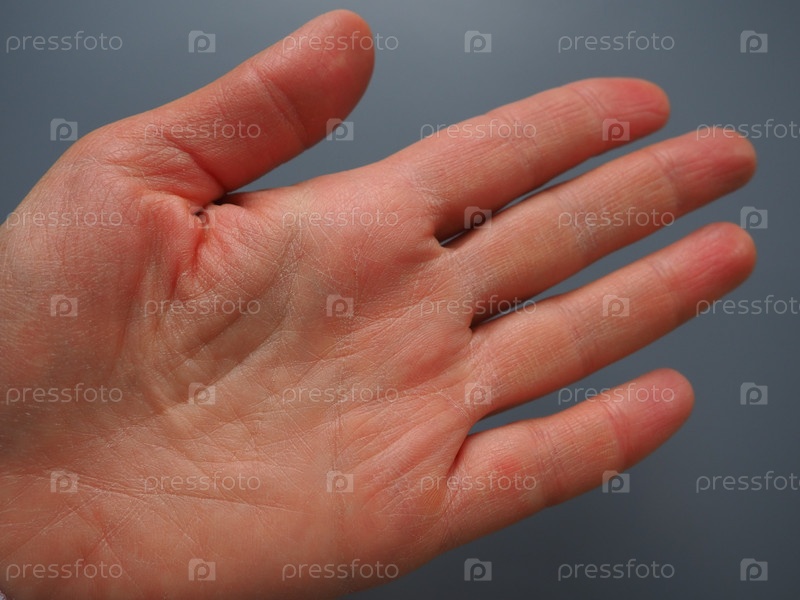Женская рука с сухой атопической кожей. Белый фон. Крупный план кожи на ладони и пальцах. Дерматологические проблемы. Гадание по линиям на руке, хиромантия