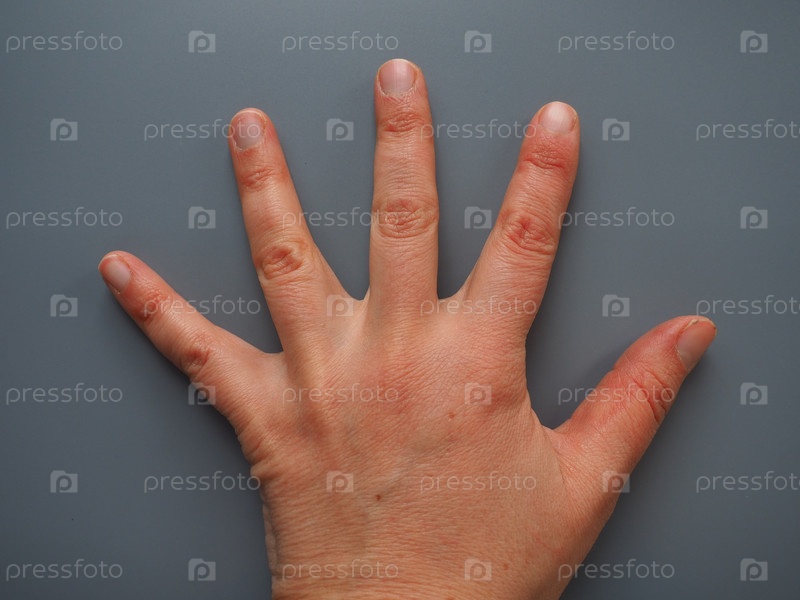 Растопырить 5 пальцев. Женская рука с сухой атопической кожей. Белый фон. Крупный план кожи на ладони и пальцах. Дерма нуждается в уходе и увлажнении. Дерматологические проблемы. Серый фон