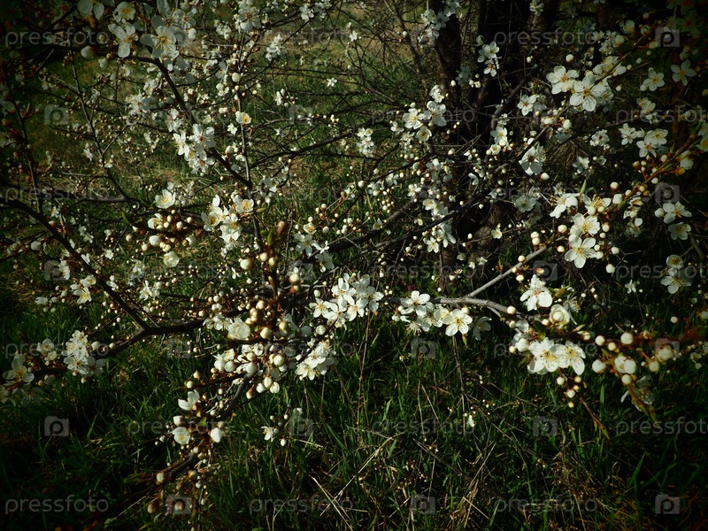 Цветущие фруктовые деревья в саду. Вишни, черешни, сливы, яблони в цвету. Белые цветы на ветвях