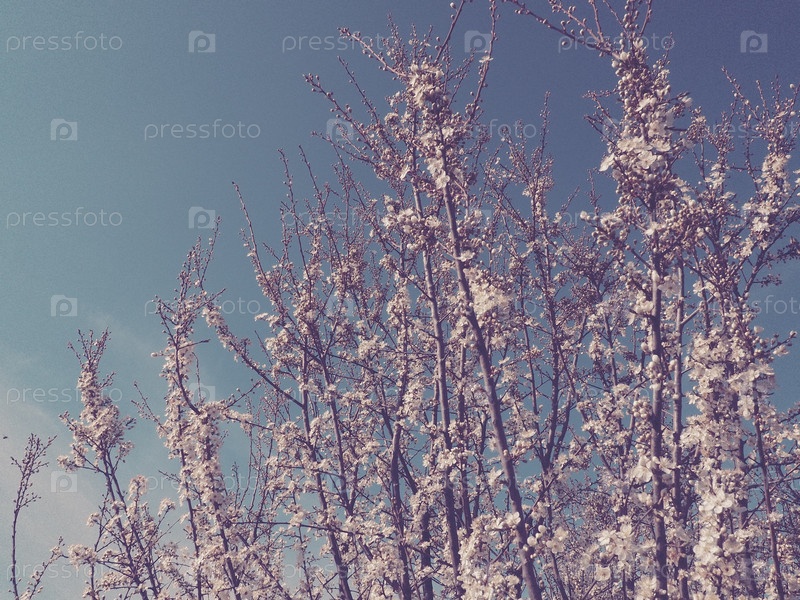 Дерево, цветущее белыми цветами. Вишня, яблоня, слива или черешня в цветущем состоянии. Нежные белые лепестки. Открытка. Поздравляю с днем весны, с днем матери. Мягкий фокус