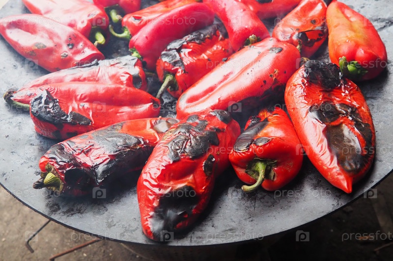 Жареный вкусный красный перец для аромата дыма и быстрой очистки. Балканские рецепты салатов. Термическая обработка урожая перца на металлическом круге. Перец выложен на плоском противне крупным планом