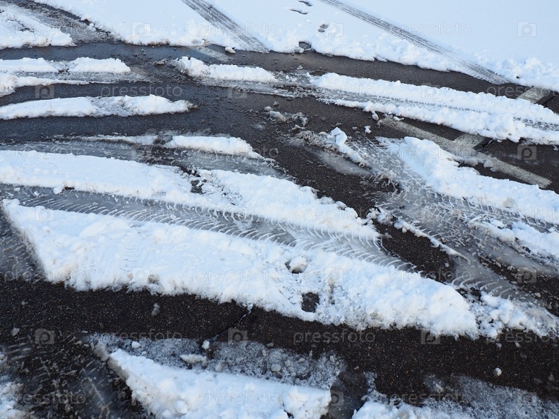 Развилка или разъезд с кольцевой развязки. Сугробы на обочине дороги. Плохая погода. Снег на асфальте. Сложные условия вождения и дорожного движения. Зимняя слякоть на дороге. Тормозной путь автомобиля
