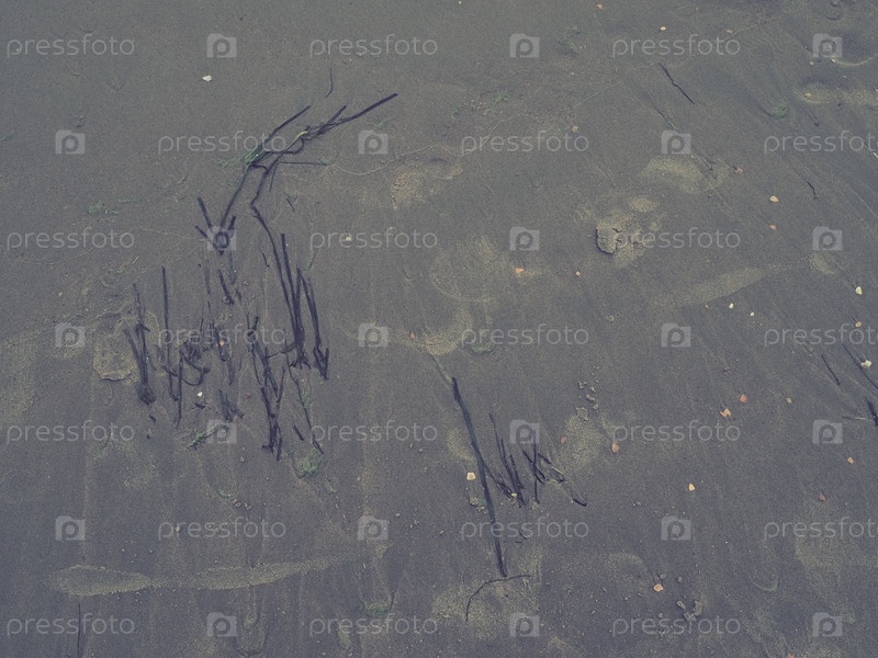 Фон из песка, водорослей и ракушек. Следы человека. Пляж после сильного дождя. Натуральный коричневый материал после шторма. Длинные водоросли выбрасываются водой из моря или океана на берег. Ламинария