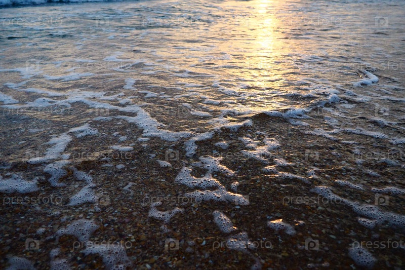 Волна и закат над морем. Красивый закат. Пенные волны перекатываются по песчаному берегу. Витязево, Анапа, Черное море. Туристическое место, курорт. Вечернее небо. Лучи отражаются от воды