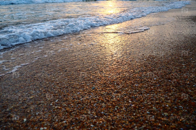 Пенные волны перекатываются по песчаному берегу. Закат над морем. Красивый закат. туристическое место, курорт. Солнечные лучи отражаются от воды. Песчаный вечерний пляж с ракушками в золотой час