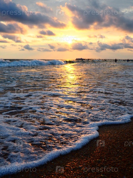 Закат над морем. Красивый закат. Пенные волны перекатываются по песчаному берегу. Витязево, Анапа, Черное море. Туристическая Мекка, курорт. Красочные облака в вечернем небе. Лучи отражаются от воды