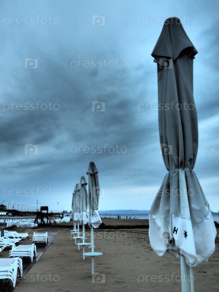 Мокрые шезлонги и зонтики на морском пляже во время сильного ливня. Свернутый зонтик на пляже на фоне темного облачного неба. Вторжение тайфуна, циклона или шторма на море или океан. Пляжный сезон
