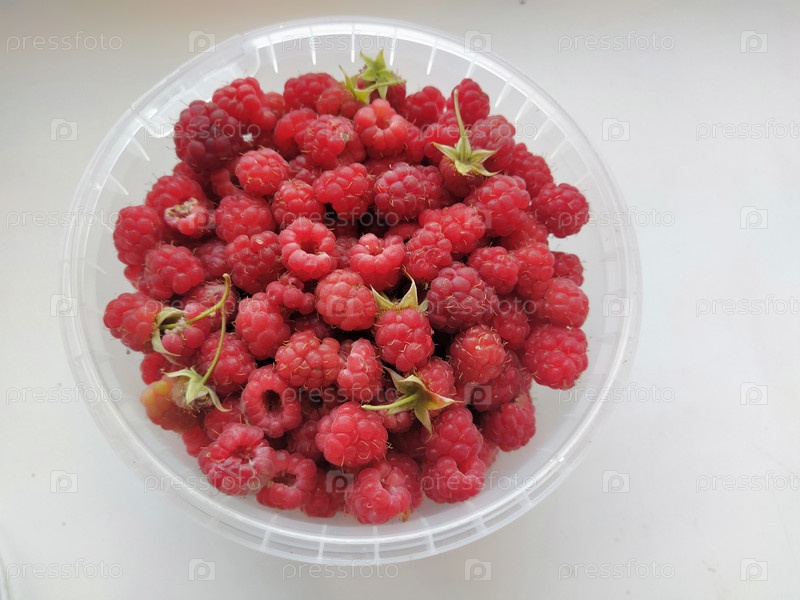 Красная сочная малина в пластиковой коробке на белом фоне, вид сверху. Малина в пластиковом ведре. Мягкий разз