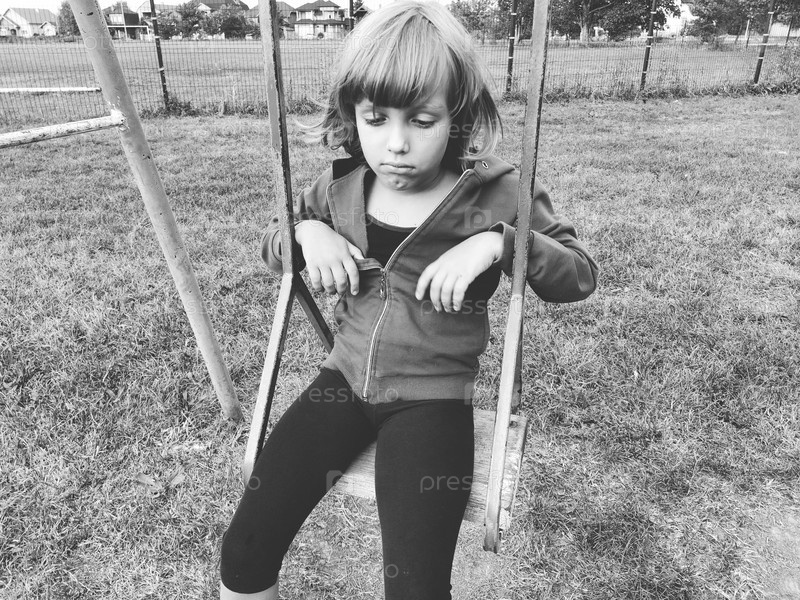 Девушка на качелях. Монохромная ретро фотография. Ребенок в спортивной форме качается. На заднем плане стадион. Грусть на лице. Эмоция разочарования и чувство одиночества