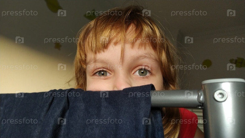 Красивая маленькая девочка прячется за спинкой двухъярусной кровати, на которой висит темно-синяя бархатная ткань. У ребенка серые глаза и светлые волосы. Видна верхняя половина лица. Пикабу