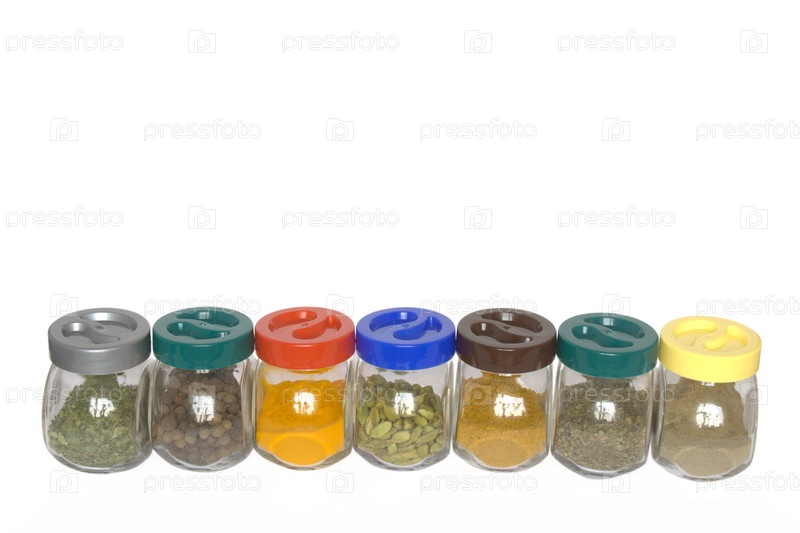 Банки с различными экзотическими специями на белом фоне
