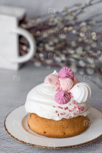 Красивый стильный натюрморт. Пасхальный кулич с безе, зефиром, пасхальными яйцами и веточками ивы на светлом бетонном фоне. Христос воскрес
