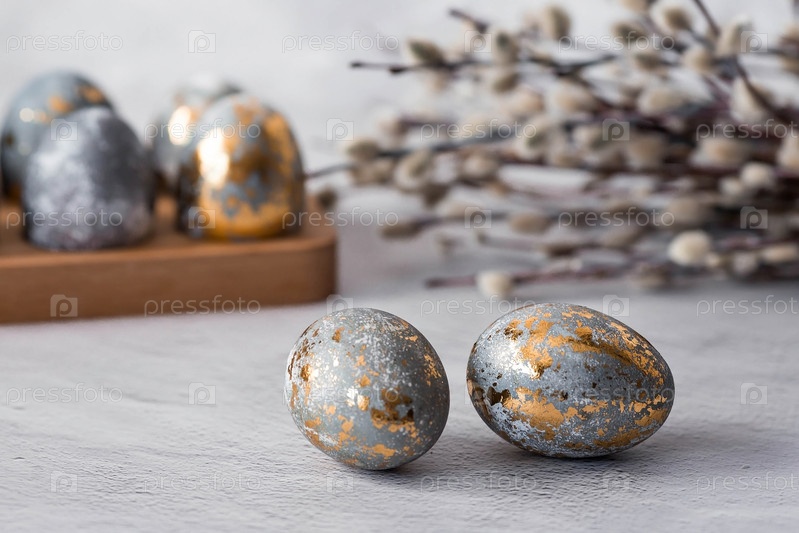 Стильные серые пасхальные яйца из мрамора и бетона с золотой поталой на сером фоне. Окрашивание яиц натуральным красителем каркаде чай. Экологичность. Естественность. Концепция счастливой Пасхи