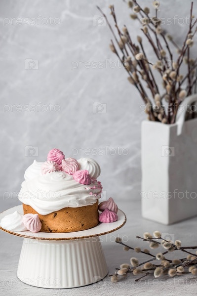 Красивый стильный натюрморт. Пасхальный кулич с безе, зефиром, пасхальными яйцами и веточками ивы на светлом бетонном фоне. Христос воскрес