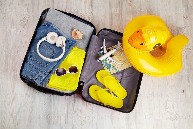 Чемодан с одеждой и аксессуарами для отдыха. Летнее путешествие
