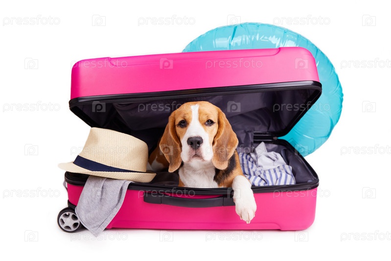 Собака бигля в чемодане с одеждой и аксессуарами для летних каникул
