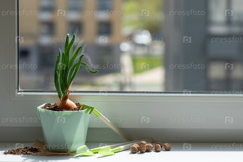 Выращивание зеленого лука на подоконнике в домашних условиях. Здоровая пища. Домашние витамины. Концепция весенней посадки, домашнего садоводства