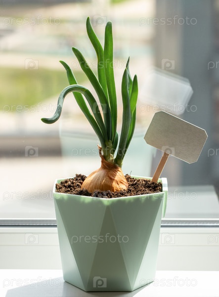 Лук с проросшими зелеными стрелками в горшке на подоконнике. Макет знака для надписи, застрявшей в почве. Концепция весенней посадки, домашнего садоводства