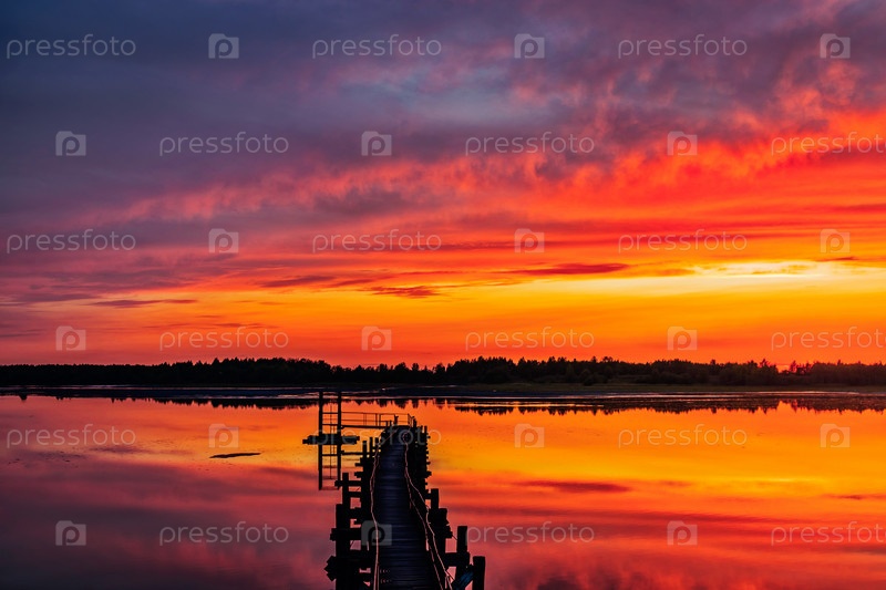 Старый железный пешеходный мост на озере на закате