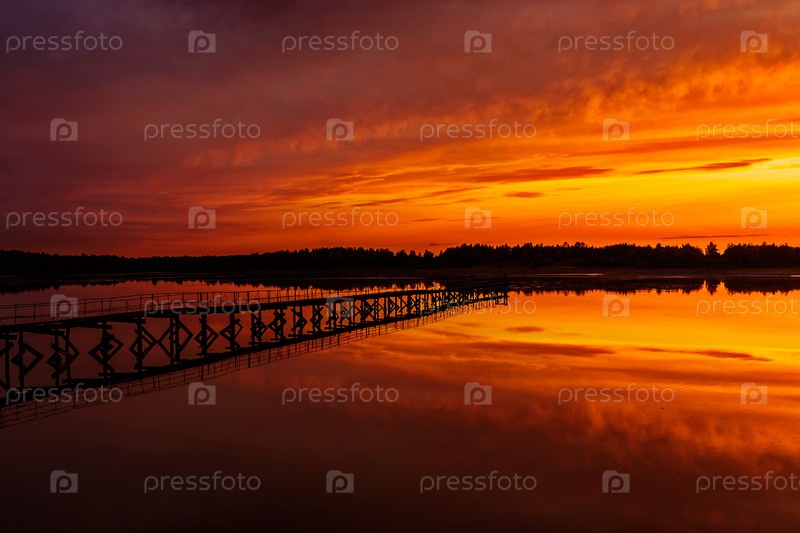 Старый железный пешеходный мост на озере на закате