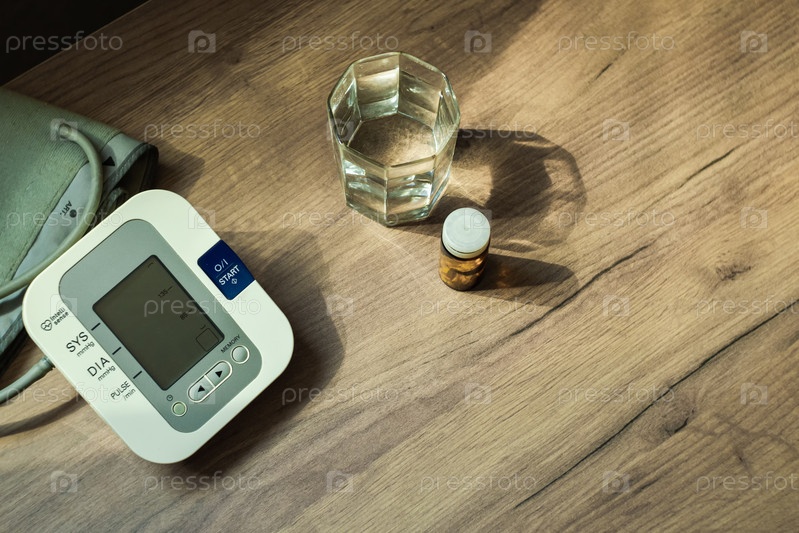 На коричневом деревянном столе стоят стакан воды, пузырек с таблетками и тонометр. Вид сверху. Концепция здоровья