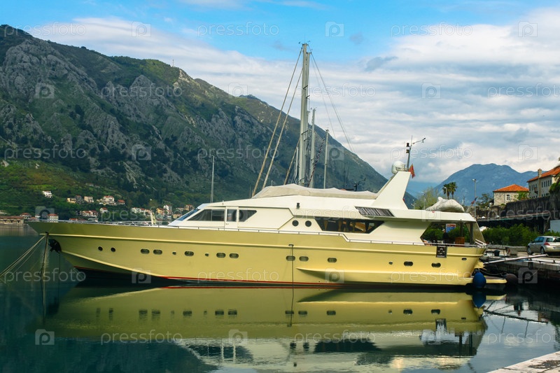 Моторная яхта пришвартована в бухте. На фоне горы и голубое небо с облаками. Красивое отражение в воде