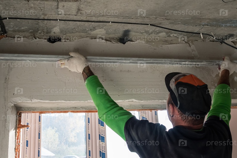 Строитель штукатурит стену алюминиевым правилом. Вид сзади. Концепция внутренней отделки