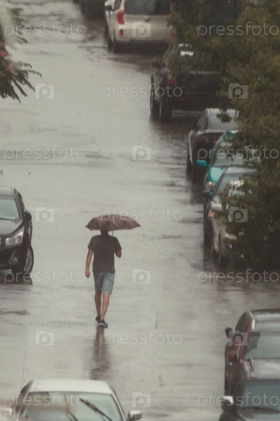 Мужчина в шортах и футболке ходит с зонтиком под дождем. Его окружают припаркованные машины. На мокром асфальте отражение мужчины и капли дождя. Серый, дождливый день