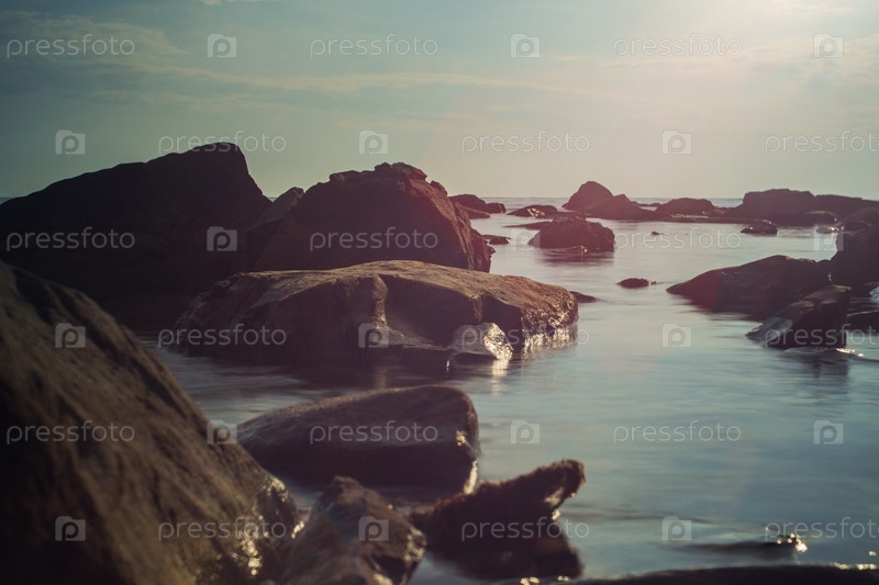 Крупный план камней в морской воде, размытых длительной выдержкой. Голубое небо с облаками на заднем плане. Красивый красный блик от объектива. Вечерний морской пейзаж