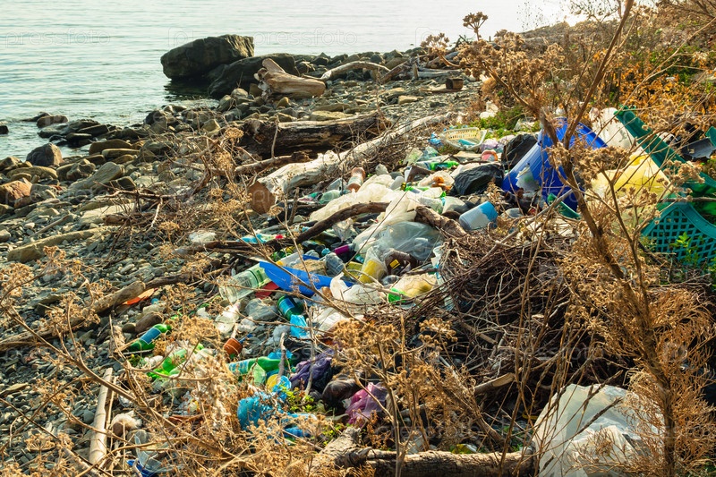 Куча пластикового и стеклянного мусора, веток и бревен на пляже. Свалка бытовых отходов на берегу