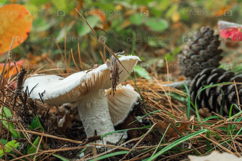 Крупный план белого несъедобного гриба и шишек. Дикий опасный гриб в хвойном осеннем лесу среди листьев и игл елей