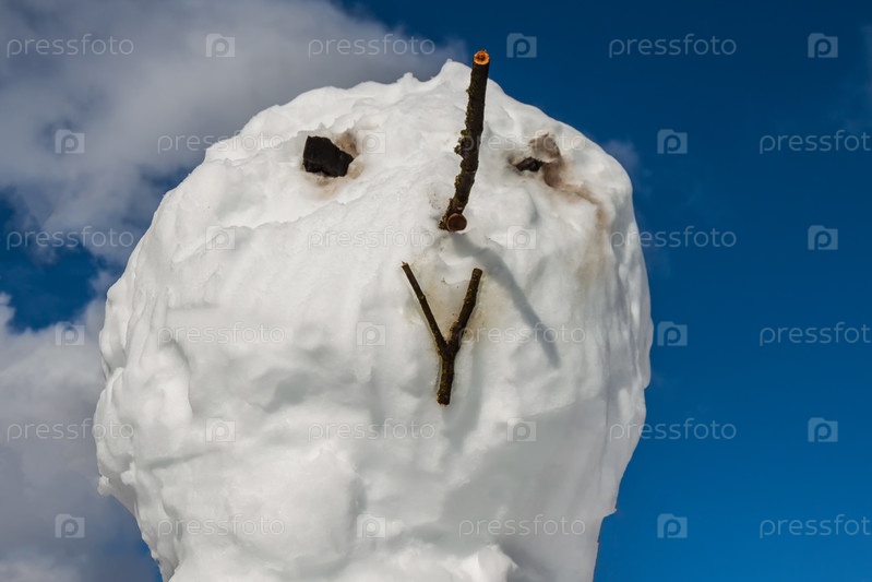 Страшное лицо снеговика на фоне голубого облачного неба. Лицо снеговика с угольками в глазах, вместо носа и рта палочки. Традиционная зимняя детская игра