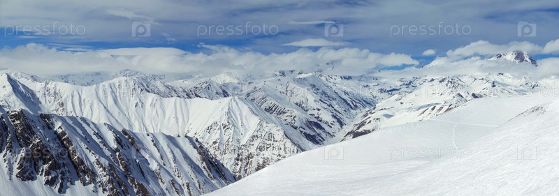 Снежные горы, вершины которых укрыты облаками. Сквозь облака видно голубое небо. Панорамное фото