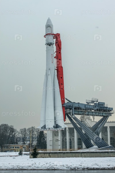 Первая в мире трехступенчатая пилотируемая ракета-носитель "Восток" на выставке в Москве. На фоне серого неба и хлопьев снега. Перевод: СССР, Восток