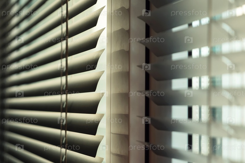 Современные серебряные алюминиевые жалюзи на окне офиса. Контролируйте степень освещенности в офисном конференц-зале. Выборочный фокус