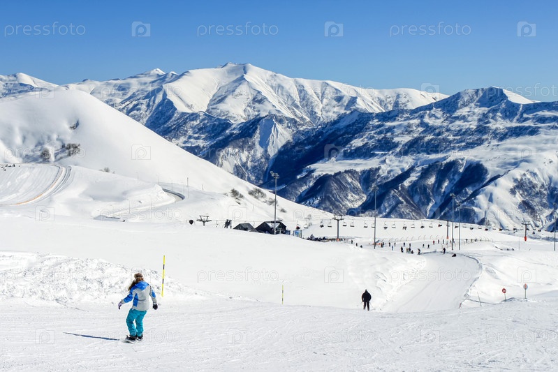 Девушка на сноуборде съезжает с лыжного склона. Перед ней едет лыжник. На заднем плане чистое голубое небо и заснеженные горные вершины. Активный зимний отдых в горах