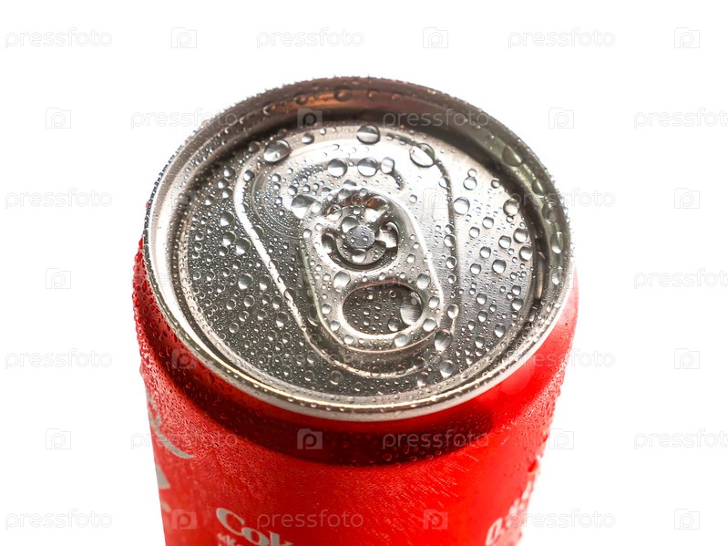 Вид сверху на алюминиевую банку Coca-Cola, покрытую каплями воды, изолированной на белом фоне. крупный план. закрытая холодная классика Coca-Cola. Россия, Краснодар, 15 декабря 2021 г