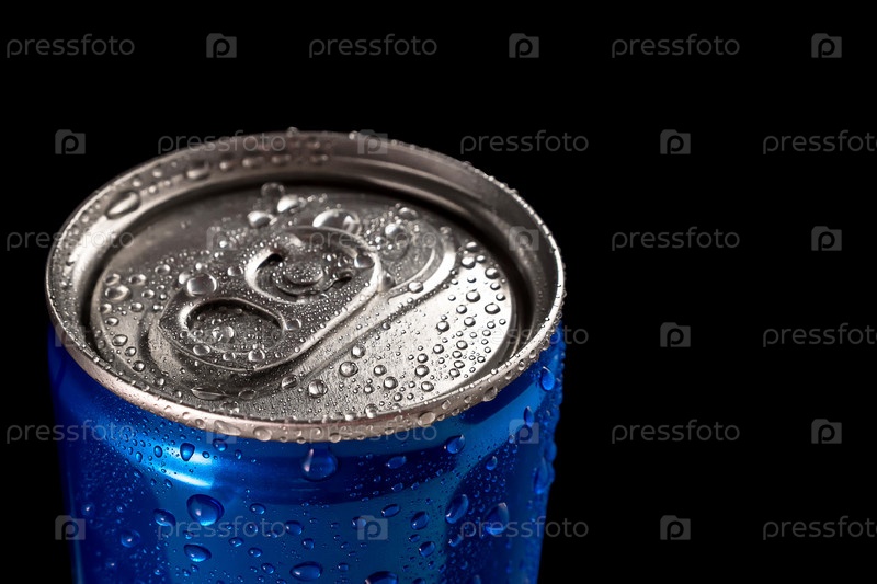 На черном фоне синяя алюминиевая банка с каплями воды. Вид сверху. Вид крупным планом