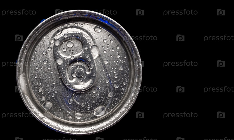 Металлическая банка с каплями воды на черном фоне, вид сверху