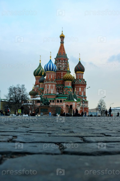 Покровский собор на Красной площади в Москве. Нижний ракурс. Сосредоточьтесь на брусчатке. Собор внесен в список Всемирного наследия ЮНЕСКО в России