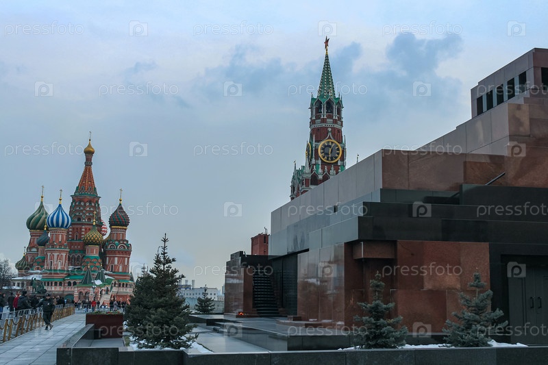 Покровский собор, мавзолей Ленина и башня Спасского Кремля с часами и звездой на Красной площади в Москве. Облачное небо на заднем плане. Россия, Москва, 20 марта 2011 г