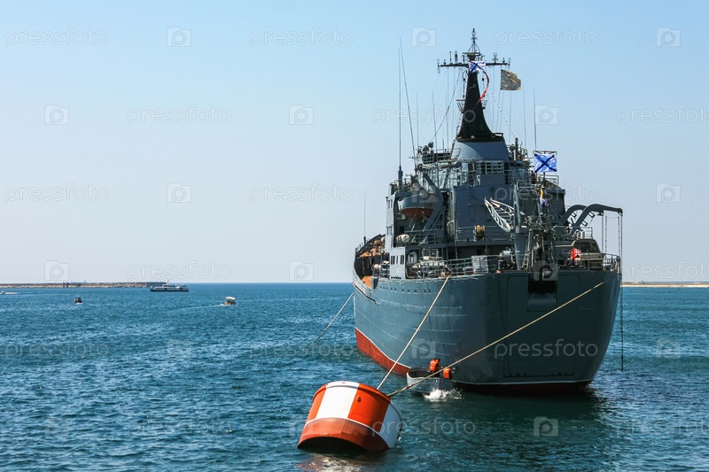 В бухте стоит на якоре военный корабль Черноморского флота России. Полуостров Крым, 25 июля 2015 г