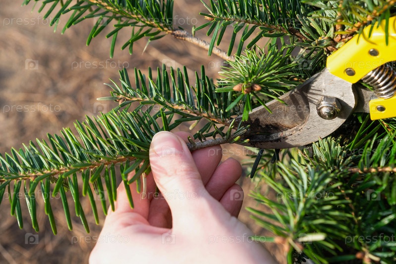 Обрезка ели секатором весной. Формирование кроны хвойного растения, уход за садом. Рука садовника ищет место, где правильно срезать ветку
