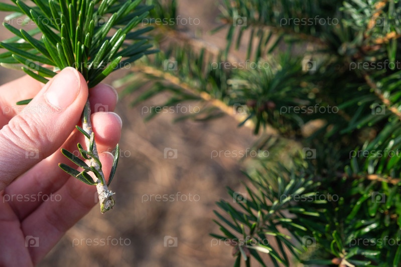 Обрезка ели секатором весной. Формирование кроны хвойного растения, уход за садом. Рука садовника ищет место, где правильно срезать ветку