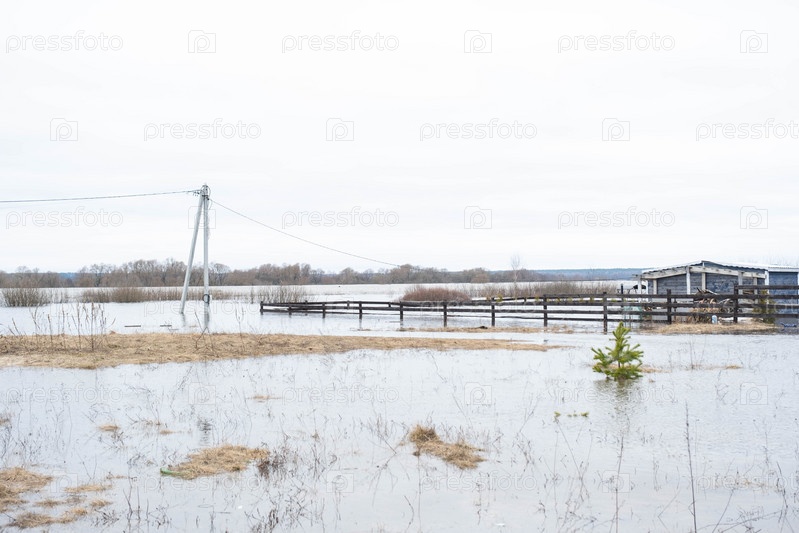 Весенний паводок в сельской местности - разлив реки, затопление придомовых территорий за забором. Элементы после таяния снега и проливных дождей