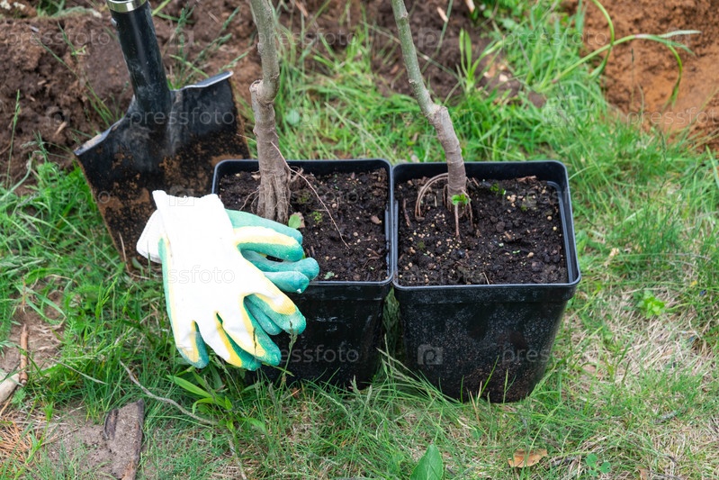 Саженец яблони в саду подготовлен к посадке в открытый грунт. Плодовое дерево из питомника, выращивание органических фруктов на своем участке