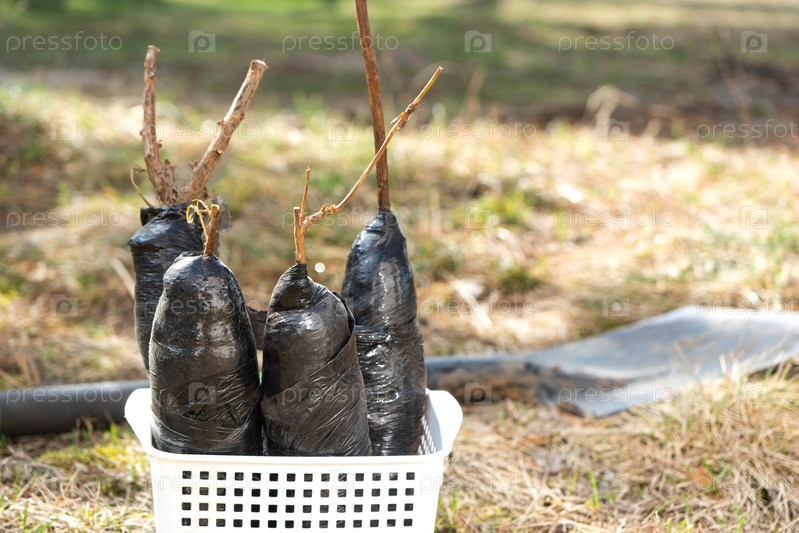 Саженцы плодовых кустарников и деревьев в тубах, готовые к посадке в саду. Подготовка к посадке, выращивание натуральных ягод на грядке