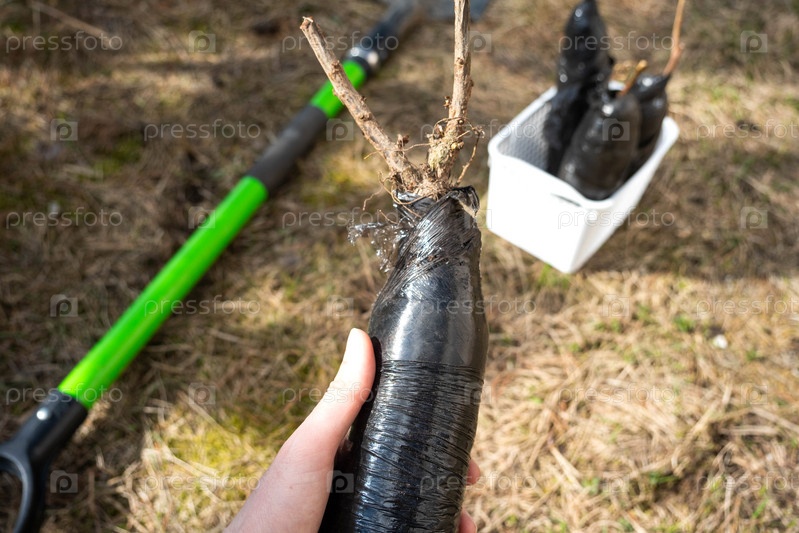 Саженцы плодовых кустарников и деревьев в тубах, готовые к посадке в саду. Подготовка к посадке, выращивание натуральных ягод на грядке