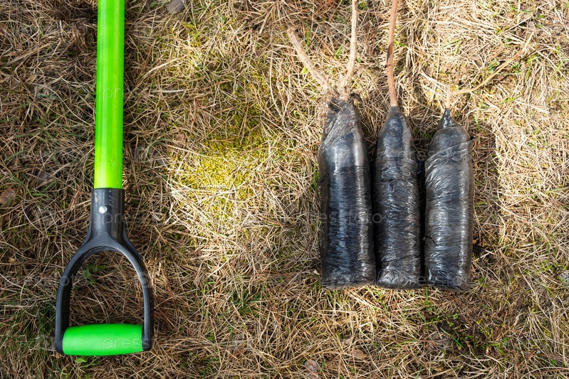 Саженцы плодовых кустарников и деревьев в тубах, готовые к посадке в саду. Подготовка к посадке, выращивание натуральных ягод на грядке