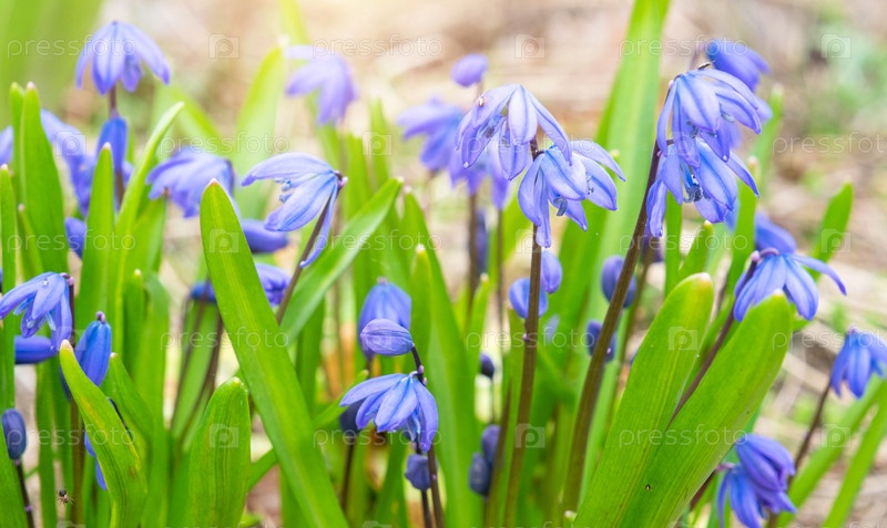 Первые весенние голубые цветы пролески крупным планом. Весна, первая зелень